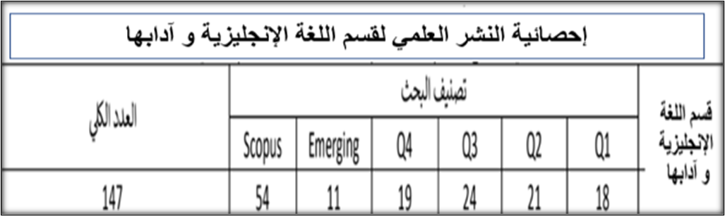 يُشارك أعضاء هيئة التدريس بقسم اللغة الإنجليزية وآدابها باستمرار في المشاريع البحثية. كما ينخرطون في مناقشات علمية للنقاش حول العديد من البحوث التجريبية والنظرية. وذلك حيث تُغطي أبحاثهم نطاقًا واسعًا من العمل متعدد التخصصات في علم اللغة، الأدب، ودراسات الترجمة . وقد خلق هذا التنوع في الاهتمامات البحثية بيئة مثالية للتعاون البحثي والمناقشة بين أعضاء هيئة التدريس.