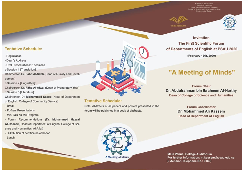 كما نظَّم قسم اللغة الإنجليزية منتدى البحث العلمي الأول في عام 2020 بعنوان "لقاء العقول". وشارك العديد من أعضاء هيئة التدريس والباحثين في المنتدى لتبادل الأفكار حول العديد من الموضوعات البحثية. كما يسعي القسم إلي نشر مجلة بحثية في القريب العاجل.
