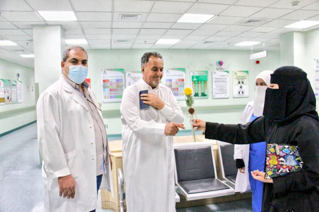 وقد تم خلال الزيارة توزيع الهدايا والورود لمرضى مركز الكلى الطاقم الصحي.