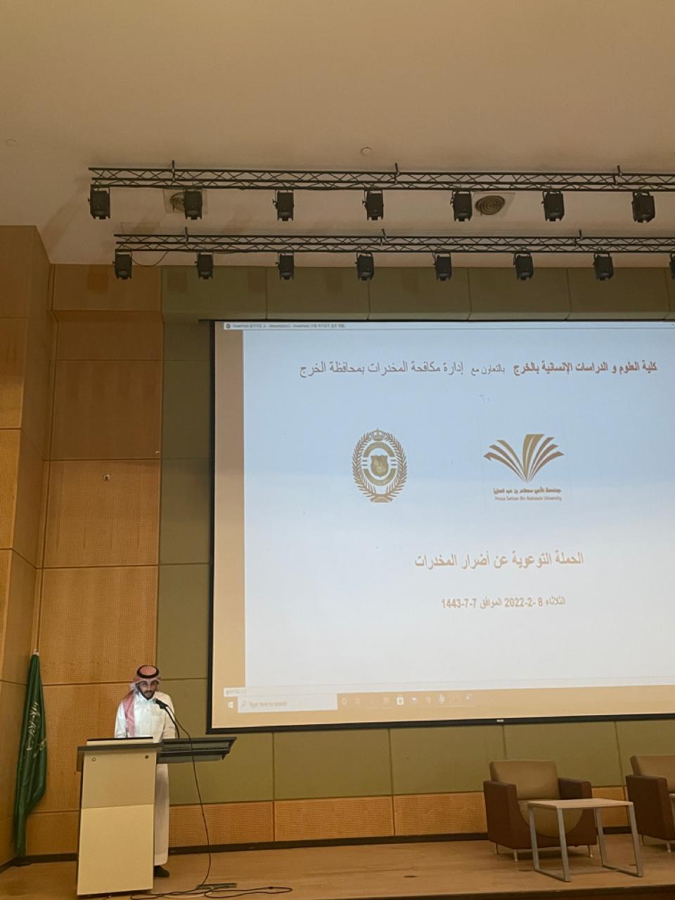 تحت رعاية سعادة عميد الكلية الدكتور عبد الرحمن بن إبراهيم الحارثي أقامت كلية العلوم والدراسات الإنسانية بالخرج اليوم الثلاثاء الثامن من فبراير ٢٠٢٢ برنامج توعوي عن أضرار المخدرات وذلك بالتعاون مع الإدارة العامة لمكافحة المخدرات بالخرج وعمادة شؤون الطلاب.