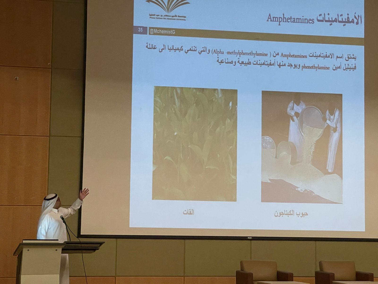حيث شارك في اللقاء سعادة الدكتور محمد المقبل رئيس قسم الدراسات الإسلامية تناول خلالها عن الجانب الشرعي لهذه الأفة تلي ذلك مشاركة للدكتور محمد بن حسين القيسي الأستاذ المشارك بقسم الكيمياء فقد قدم عرضًا أوضح فيه الجانب العلمي لتأثير وأثار المخدرات على الشخص والمجتمع.