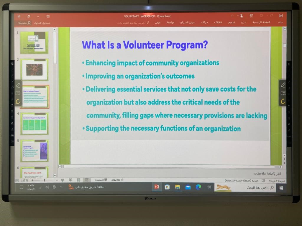 وقد تناولت الدورة تطوير الوعي بالمسؤوليات تجاه المجتمع وماهي المهام التي يمكن البدء بها لخدمة المجتمع بشكل فردي وجماعي وكيفية تخطيط وإعداد جداول زمنية للأنشطة التطوعية وتدريب المطوعين الجدد وأيضا تطرقت إلى تقييم الأنشطة التطوعية، وفي نهاية الدورة تمت مناقشة قائمة بعدد من الأنشطة التطوعية الممكنة لتشجيع الطالبات.