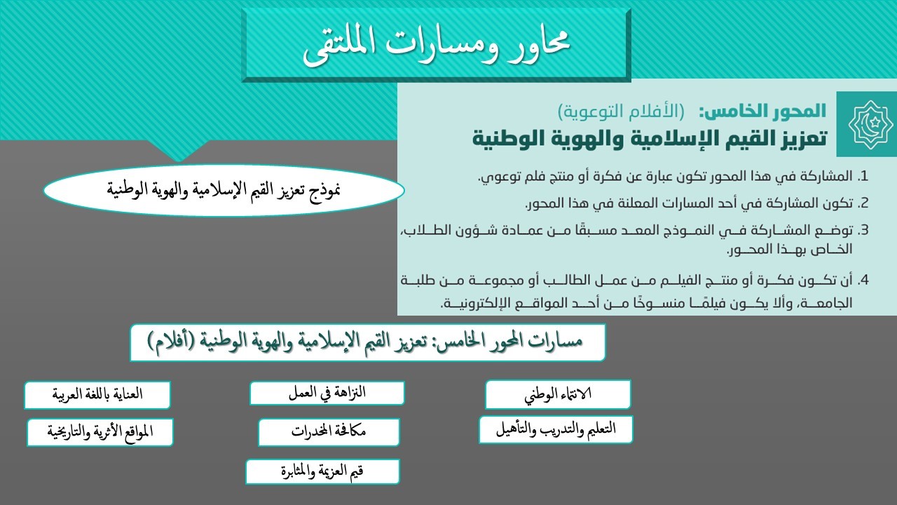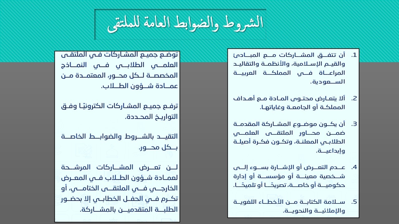 وقد تطرقت خلال الورشة إلى عدة نقاط منها " أهداف الملتقى والشروط والضوابط العامة للمشاركة في الملتقى وقد تم أيضاً تناول المحاور الرئيسية ومسارات كل محور والدعم المالي والجوائز حيث يتميز الملتقى لهذا العام على أن تكون المشاركات الطلابية عبارة عن فكرة علمية أو منتجاً، توضع على «ملصقات علمية» وتحكم داخل الكليات، وترشح كل كلية المشاركات الفائزة في كل محور لتتأهل لمرحلة التحكيم السري على مستوى الجامعة.