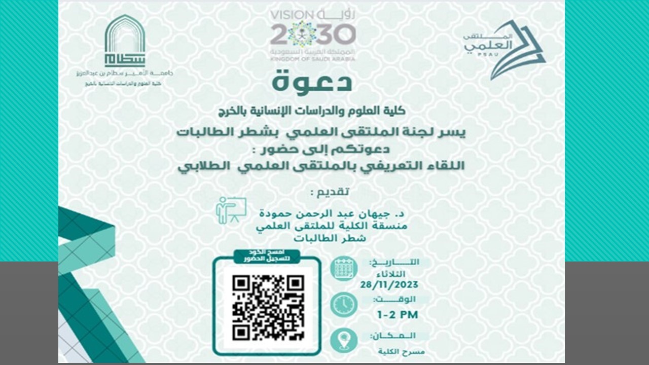 تحت رعاية وكيلة كلية العلوم والدراسات الإنسانية بالخرج (أقسام الطالبات) الدكتورة نوال عبد العزيز الفهيد قامت لجنة الملتقى العلمي الطلابي بوحدة الانشطة الطلابية بعمل ورشة تعريفية عن الملتقى العلمي لمنسوبي الكلية من أعضاء هيئة التدريس والطالبات يوم الثلاثاء الموافق 14/ 5/ 144هـ في تمام الساعة 1 ظهراً وذلك بقاعة التدريب بالكلية وقامت بتقديمها د/ جيهان عبد الرحمن حمودة منسقة الملتقى العلمي.