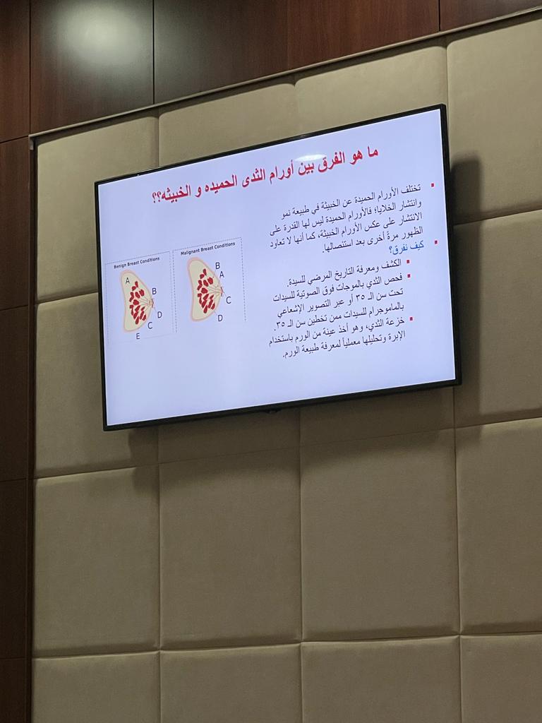 فقد اشتملت المحاضرة تعريف عن المرض وتاريخه الوراثي وطرق وأساليب الكشف المبكر عن المرض وأهمية العلاج المبكر تفاديًا للوصول للمرحلة الحرجة، واتخاذ التدابير الوقائية من الإصابة بمرض سرطان الثدي كالمحافظة على التغذية السليمة وتفادي السمنة وممارسة الرياضة والكشف الشهري الإكلينيكي والوقاية خيرًا من العلاج.