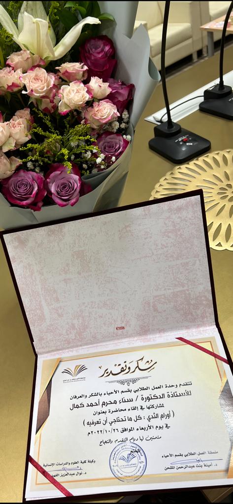 برعاية وكيلة كلية العلوم والدراسات الإنسانية بالخرج (أقسام الطالبات) سعادة الدكتورة نوال الفهيد نظمت وحدة العمل الطلابي بالتعاون مع طالبات قسم الأحياء وبإشراف الدكتورة أمينه المشحن، متمثلة بالأنشطة الثقافية والاجتماعية محاضرة تثقيفية بعنوان (أورام الثدي كل ما تحتاجي أن تعرفيه) ألقتها الأستاذة الدكتورة سناء كمال من كلية الطب بجامعة الأمير سطام بن عبد العزيز وذلك يوم الأربعاء الموافق ١ / ٤ / ١٤٤٤هـ في مسرح الكلية.