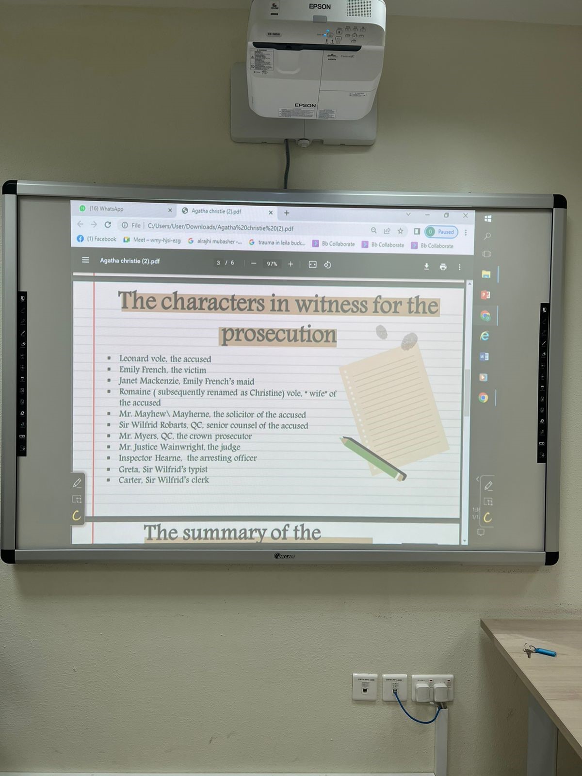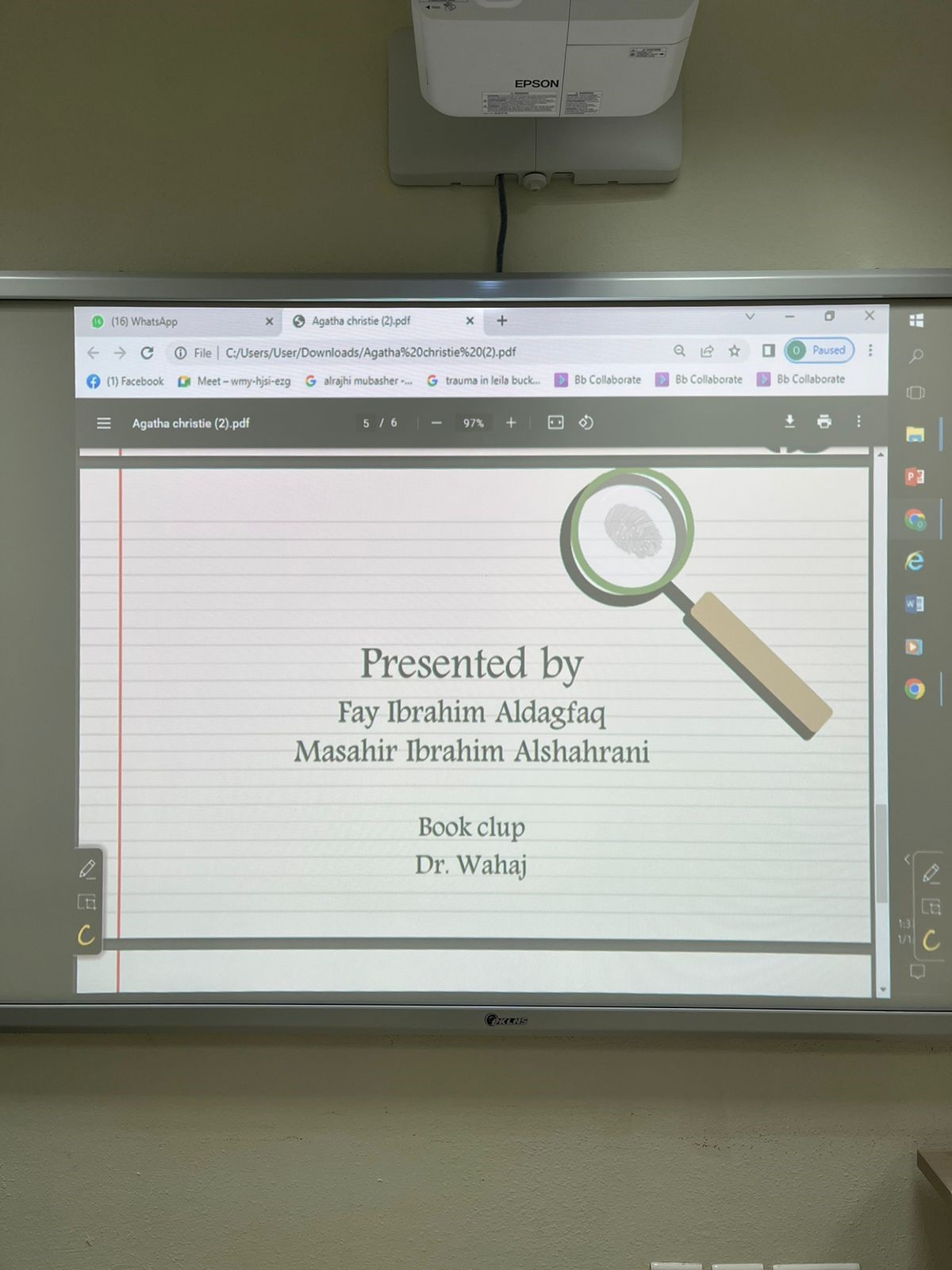 حيث قامتا الطالبتان في إبراهيم الدغفق ومساهر إبراهيم الشهراني بتقديم رواية (شاهد النيابة) وتم عرض خلفية للكاتبة أجاثا كريستي وانتقلوا إلى سرد الشخصيات الرئيسية، بعد ذلك لخصوا الرواية وتحدثوا عن ملامح الرواية التي أعجبتهم أكثر وأيضًا ناقشوا أعظم أعمال أجاثا كريستي باعتبارها ثالث أكثر الأعمال شعبية في الأدب الإنجليزي.