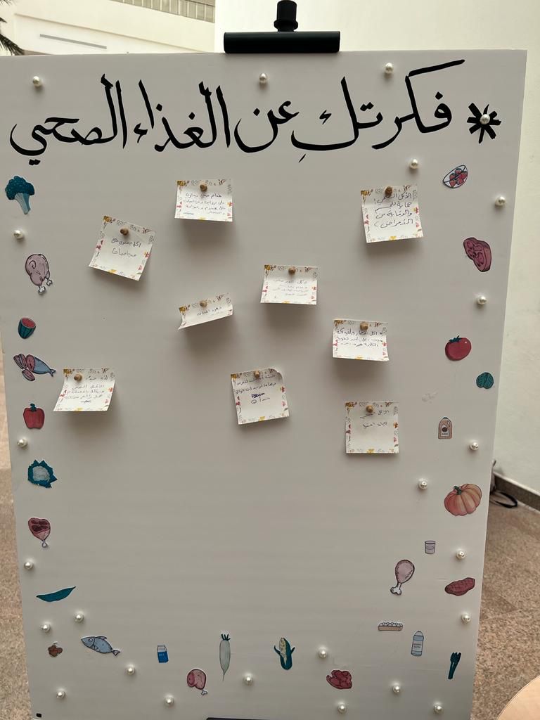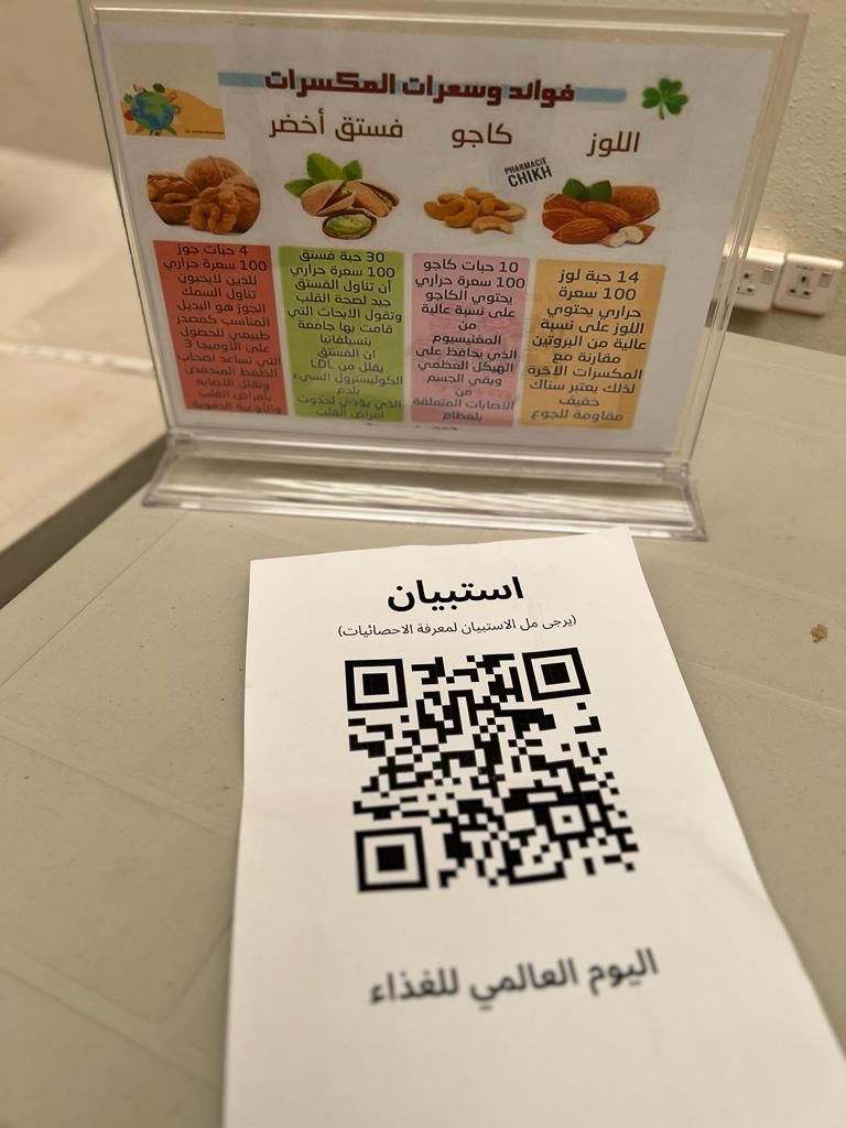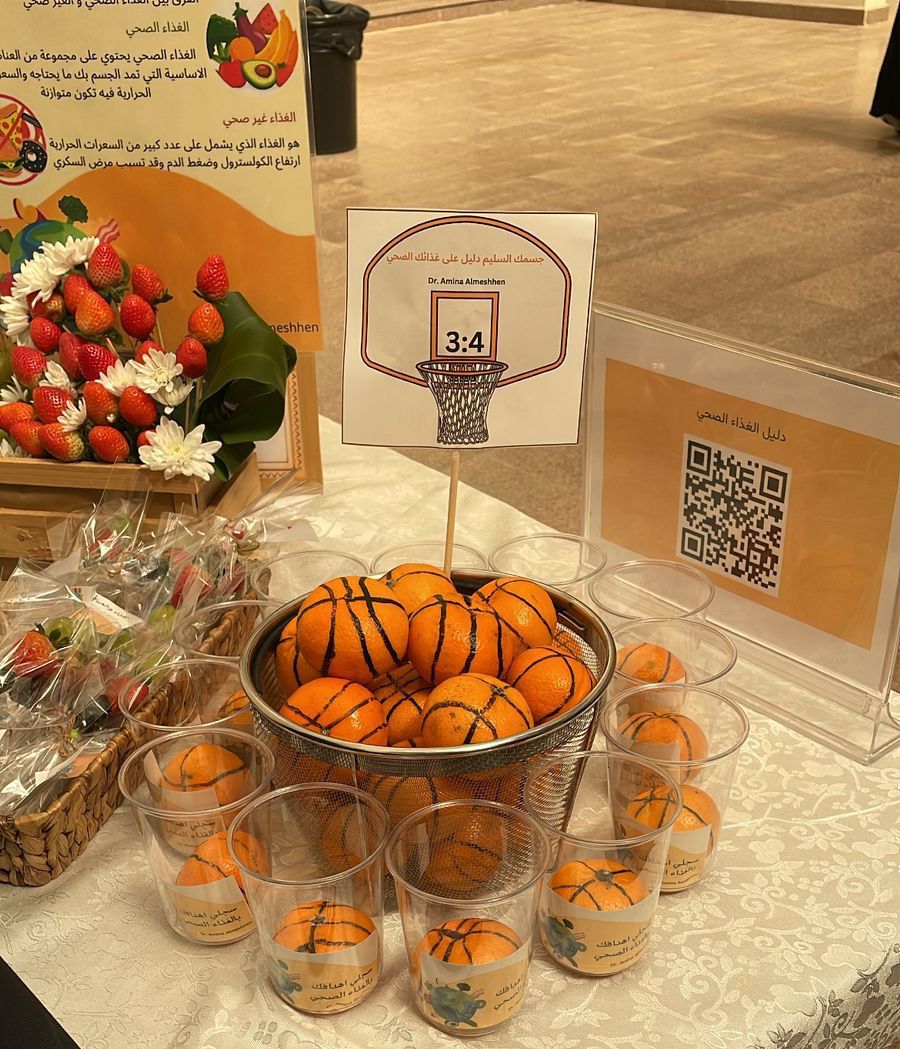 تحت شعار الغذاء والحياة وتفعيل لليوم العالمي للغذاء وبإشراف الدكتورة أمينه عبد الرحمن المشحن أقمن طالبات مقرر أحياء عامة (1) بقسم الأحياء يوم الثلاثاء ٢٣ / ٤ / ١٤٤٥هـ في ساحة الكلية نشاط توعوي عن أهمية الغذاء في المراحل العمرية لحياة الانسان، وأهمية الغذاء العضوي واستبداله على الأغذية المصنعة، ومن خلال مسح رمز الاستجابة السريع تم اطلاع الطالبات على توصيات منظمة الصحة العالمية للاستهلاك اليومي من الغذاء.