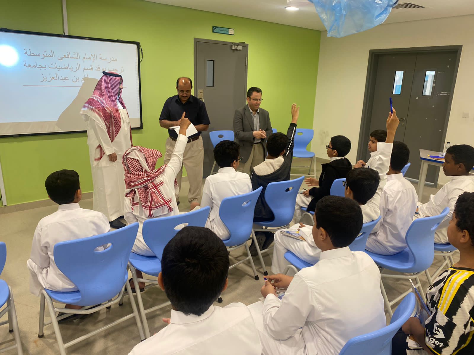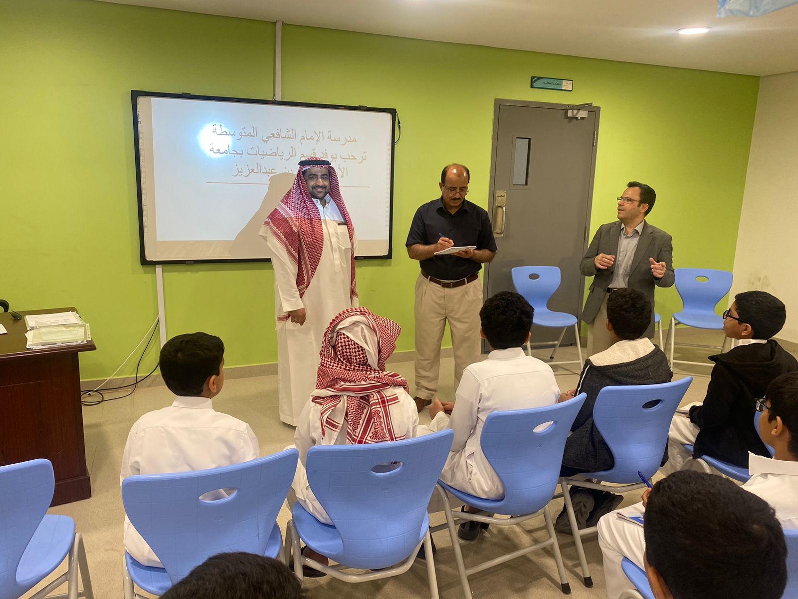 حيث التقى الوفد متمثلًا بكل من د. عبد الكريم حمارشة منسق لجنة خدمة المجتمع بالقسم و د. خضر خان و د. فهد الجعيدي بعدد من طلاب المدرسة وتحدثوا عن أهمية الرياضيات وتطبيقاتها وقاموا بالإجابة على أسئلة واستفسارات الطلبة.