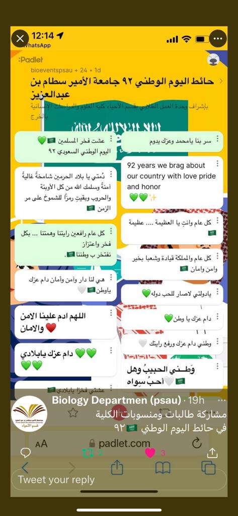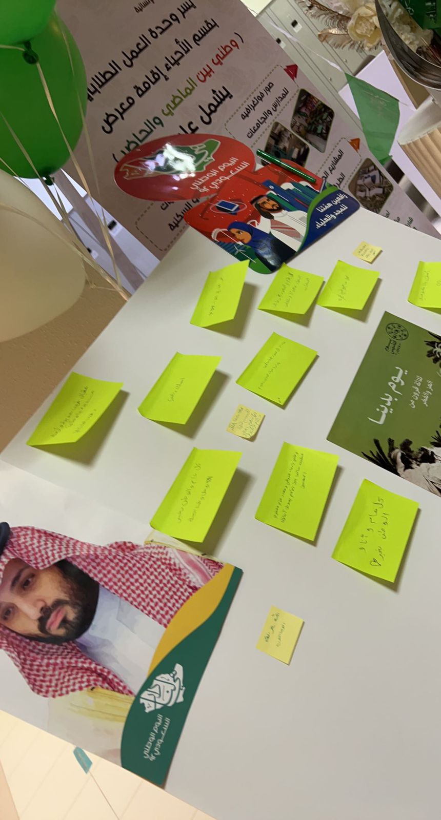 تحت شعار# هي-لنا –دار بمناسبة اليوم الوطني السعودي ٩٢ أقامت وحدة العمل الطلابي بالتعاون مع طالبات المجلس الطلابي بقسم الأحياء والطالبات المشاركات بالأنشطة الطلابية وبإشراف سعادة الدكتورة أمينه عبد الرحمن المشحن مشرفة وحدة العمل الطلابي، معرض فوتوغرافي عنوانه (وطني بين الماضي والحاضر) يوم الثلاثاء ١ /٣ / ١٤٤٤هـ أمام قسم الأحياء بالدور الأول.