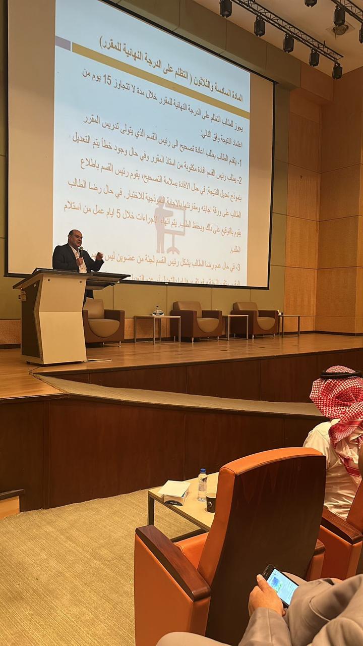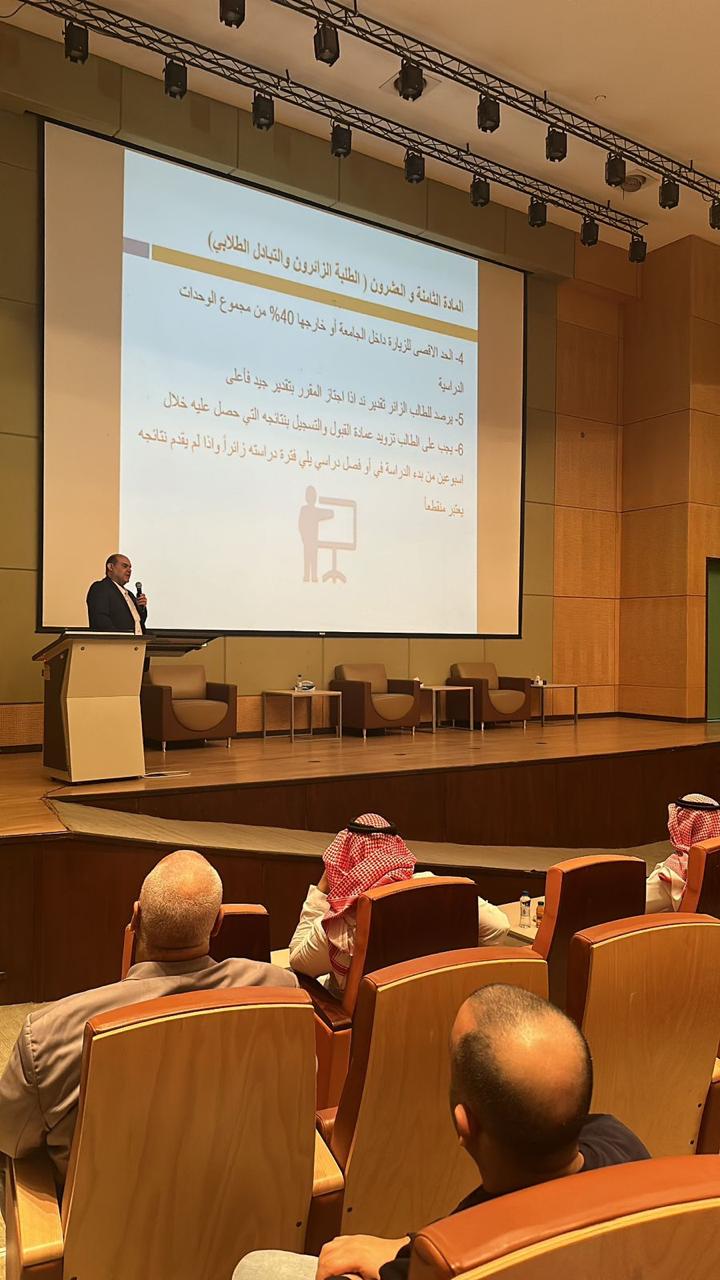 حيث تسعى هذه الورشة لاطلاع أعضاء هيئة التدريس بدورهم في الإرشاد الأكاديمي وكذلك لعرض لائحة الدراسة والاختبارات بالجامعة والتي من خلالها تُمكنهم من تقديم أفضل الخدمات للطلاب والطالبات وذلك بتوجيههم للخيار المناسب لهم خلال رحلتهم الجامعية.