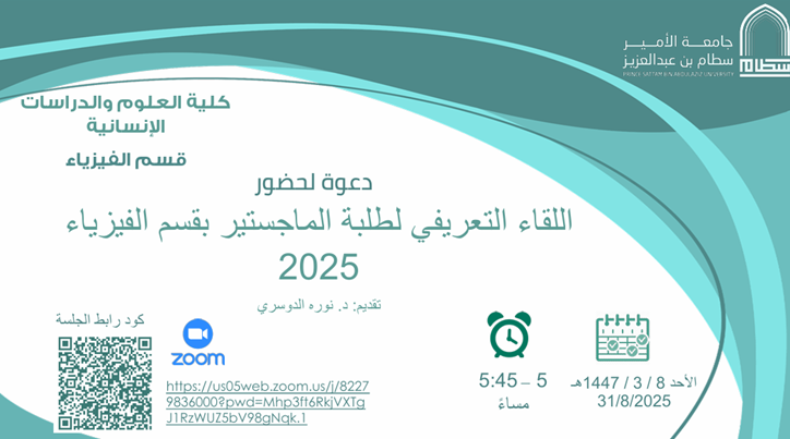 تم عقد اللقاء يوم الأحد الموافق 31/8/2025م من الساعة (5:00 – 6:00) مساءً (اونلاين). استهدف اللقاء طلاب الماجستير بقسم الرجال وقسم السيدات، بالإضافة إلى الطلبة المقبولين في الفصل الدراسي الثاني من العام الجامعي السابق.